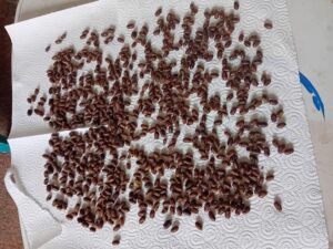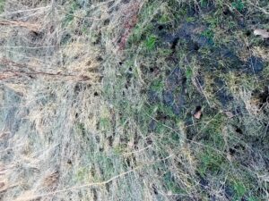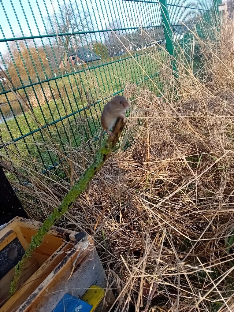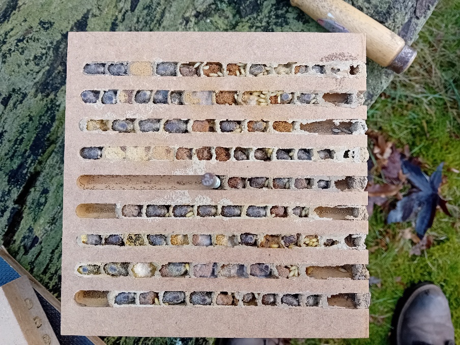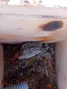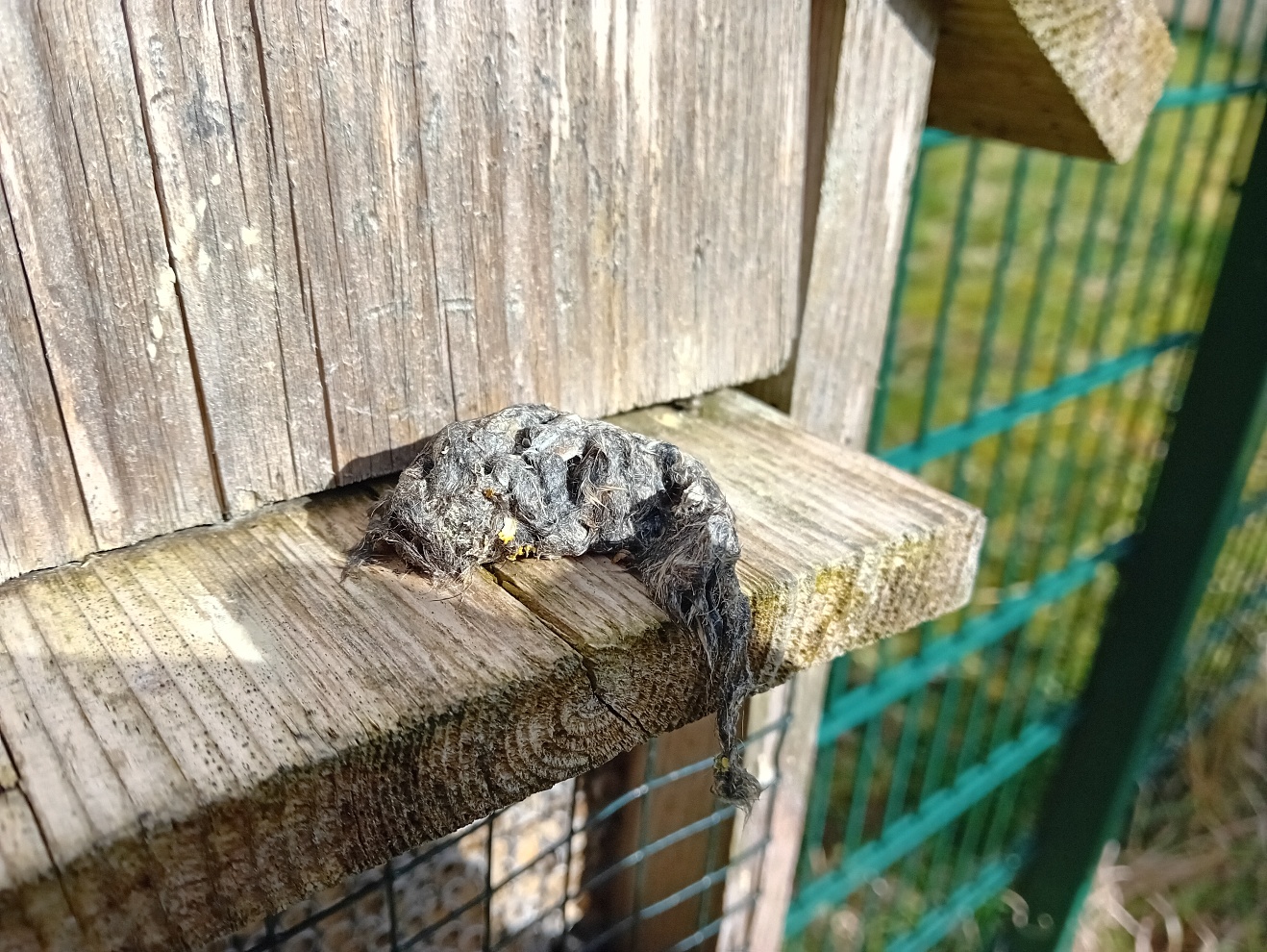 Die Nistkästen wurden im Winter nun gesäubert. Im Hummelkasten hatte sich ein Wespenstaat eingenistet, die Waben sind nun verlassen. Unter den Waben hatte es sich eine Maus gemütlich gemacht. Die Brutkästen für die Mauerbienen waren dieses Jahr sehr gut angenommen worden. Beim Reinigen zeigt sich dann aber auch, dass sich auch so manche Tauffliege und andere ‚Schmarotzer‘ sich mit eingenistet hatte, aber das gehört dazu. Dennoch haben sich erfreulich viele Puppen entwickelt. Wir sind gespannt, wie viele Bienen im Frühjahr schlüpfen werden. Unter der Schneedecke haben sich viele Mäuse wohl gefühlt und viele Gänge angelegt. Die ‚Gewölle‘ (unverdautes Fell/Knochen, das Greifvögel auswürgen), die man an den Sitzstangen und hier an Bienennistkasten finden kann, zeigen aber, dass das die Eulen das entdeckt haben und sich darum kümmern. Auf jeden Fall hat sich die Fläche als Refugium für die Natur bewährt – und wir sind gespannt auf die Entwicklungen im nächsten Jahr!